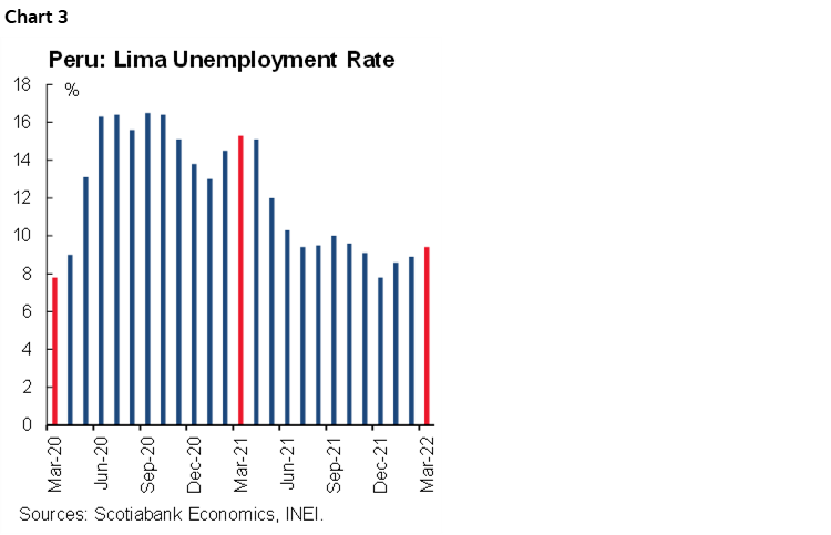 Employment may be showing some initial effects of this uncertainty. The unemployment rate rose in Lima for a fourth consecutive month, from a low of 7.8% in December 2021 to 9.4% in March 2022 (chart 3). In December (Q4-2021), unemployment had briefly touched on pre-COVID-19 levels, but this recovery was fleeting. The number of jobs in Lima has remained stagnant at 4.9 mn since December. The silver lining here is that adequate jobs have risen from 40% below pre-COVID-19 levels, to 16% below.