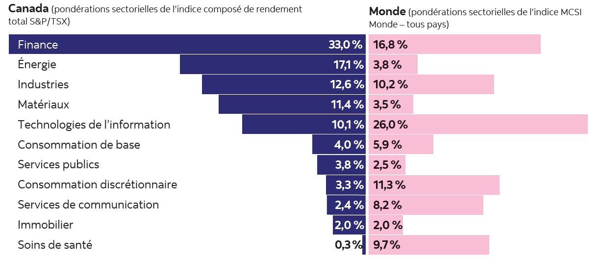 Source : Morningstar. À titre indicatif seulement. Le graphique illustre la pondération par secteur pour chaque indice. Indice composé de rendement global S&P/TSX et Indice MSCI Monde en date du 31 décembre 2024.