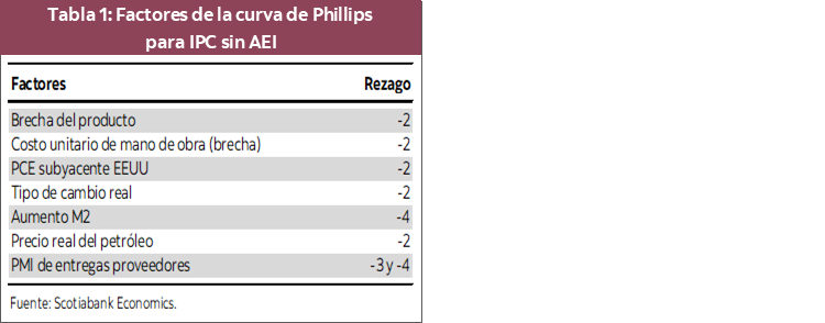 En el modelo macroeconómico de Scotiabank para Canadá y Estados Unidos, la función de cálculo de la inflación subyacente de Canadá (IPC sin alimentos, energía e impuestos, o IPC sin AEI1) incorpora un rezago para reflejar las rigidices nominales, un adelanto para representar las expectativas a futuro y siete factores clave que son fuentes de shocks en la economía. Estos factores figuran en la tabla 1 e incluyen variables internas como la brecha del producto, el costo unitario de la mano de obra y la masa monetaria (M2). Además, las limitaciones de la oferta y los cuellos de botella del suministro (reflejados por el índice PMI de entregas de proveedores), las presiones internacionales sobre la inflación subyacente (a través de la inflación subyacente de Estados Unidos según el indicador del gasto de consumo personal, o PCE), el tipo de cambio y el precio del petróleo también juegan un papel2. En “épocas normales”, los factores más importantes son la brecha del producto, el costo unitario de la mano de obra, el tipo de cambio y el precio del petróleo. En épocas de grandes presiones inflacionarias y limitaciones de la oferta a nivel global como las que hemos estado enfrentando, el índice PMI de entregas de proveedores y la inflación subyacente de Estados Unidos se convierten en determinantes clave de la inflación. En nuestro modelo, la inflación según el IPC total se pronostica combinando la proyección del IPC sin AEI con el precio del petróleo.