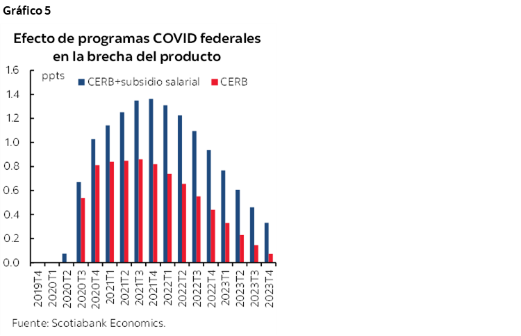 c. El oportuno, pero posiblemente exagerado, apoyo fiscal que brindó el gobierno federal de Canadá en respuesta a la pandemia (formado específicamente por una serie de programas que incluyeron beneficios directos de emergencia, beneficios de recuperación, subsidios salariales para empresas y programas de alivio de alquileres) tuvo un impacto considerable en la brecha del producto. Estimamos que estos programas hicieron que la brecha aumentara en cerca de 1.3 puntos porcentuales, lo que significa que el exceso de demanda que ahora se observa en Canadá no existiría sin estos apoyos.