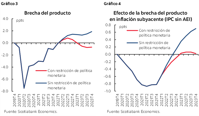 En vista del aumento de la brecha del producto debido a los programas de apoyo introducidos en respuesta a la pandemia, el Banco de Canadá debe subir la tasa de política monetaria en unos 125 pb más que el umbral superior a su estimado de tasa de interés neutral.