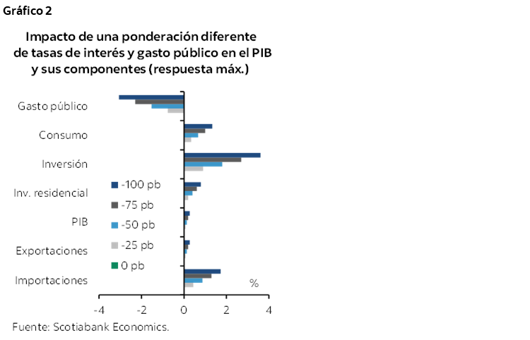 Para ilustrar lo anterior, usamos nuestro modelo y estimamos cuánto debe el gobierno moderar su consumo para limitar el alza de las tasas de interés a 2.25% y lograr la misma trayectoria de inflación que en nuestra proyección actual. El valor de 2.25% no es un número mágico, simplemente lo usamos como punto estimado para demostrar el impacto que podría tener una combinación diferente de políticas. En realidad, según nuestra proyección actual, el Banco de Canadá debería subir la tasa de política monetaria hasta 3.00% para el cierre de este año. Por otro lado, en nuestras previsiones asumimos que el consumo real del gobierno aumentará en 4.8% de aquí a 2024. En sí, se trata de un incremento relativamente suave del gasto público en comparación con el periodo posterior a 2015. Sin embargo, nuestro análisis da a entender que un aumento total más moderado del gasto público real de aquí a 2024, por el orden de 2.5%, permitiría al Banco de Canadá culminar su ciclo de endurecimiento monetario con las tasas de interés en 2.25%.