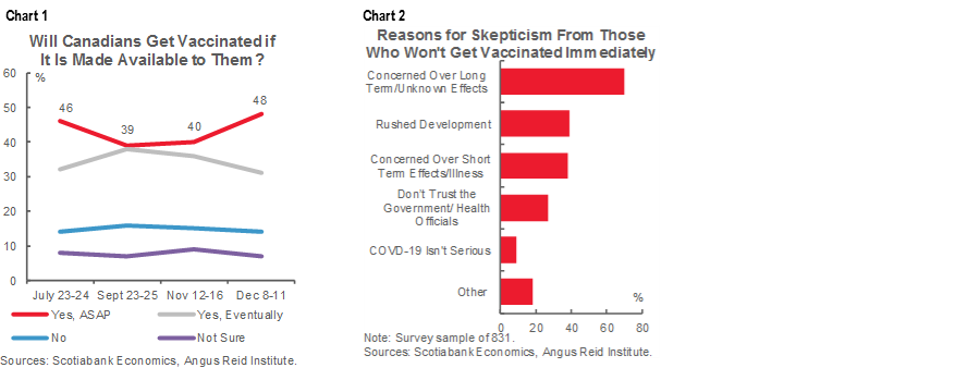 The main focus into tomorrow’s North American session may be BoC Governor Macklem’s traditional pre-holiday Governor’s speech. He might find reason for optimism in survey results that were released today that show just shy of 80% of Canadians expect to go for COVID-19 vaccinations, though the minority who say they won’t might take a long time to possibly change their views (charts 1–2). Macklem’s topic will be “Trading for a sustainable recovery.” The speech will be released at 2:30pmET and a virtual press conference will be held at 3:45pmET.