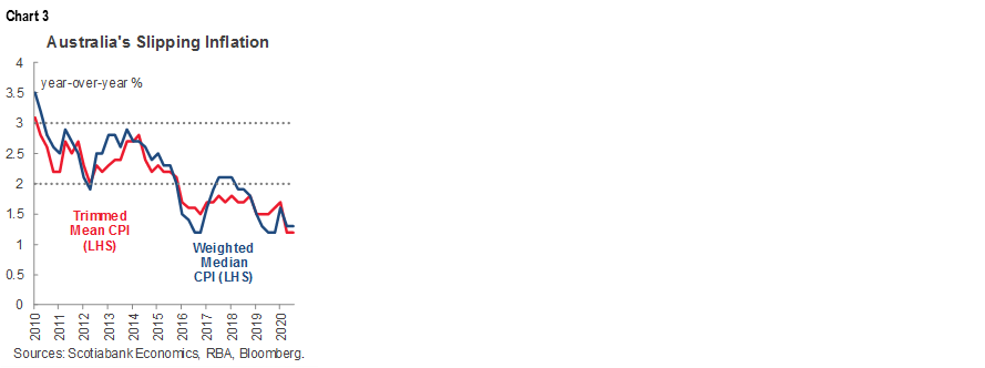 - For one, average Australian core inflation (1¼% y/y) is further beneath the RBA’s higher headline inflation target of 2–3% (chart 3) than is the case for the BoC where average core inflation sits at 1.8% and just tenths from the headline inflation target of 2%.