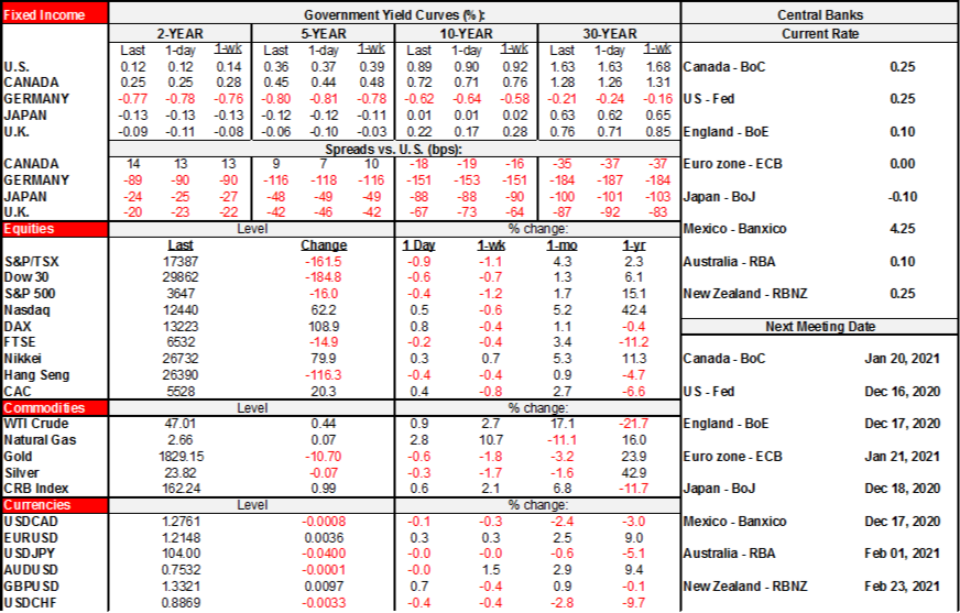After getting off to a solid start on Brexit and US stimulus speculation, US stocks began to turn south the minute NYC Mayor Bill De Blasio said that “If we do not change the trajectory, we could very well be headed to shut down” and that “The likelihood of more restrictions soon is high.” What may have also contributed to the soured market tone was growing realization of the magnitude of a cyber attack on US government agencies and companies with speculation that Russian hackers were involved. Outgoing President Trump spent the day tweeting about election conspiracies which may indicate that the hostile act will confront incoming President Biden.