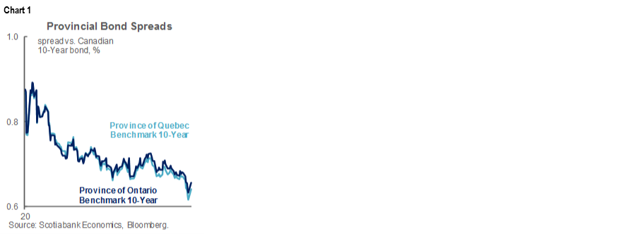 The Ontario government is the latest to extend aggressive lockdowns (details here). The widening in 10 year spreads today was comparable to Quebec and consistent with a general global risk-off tone (chart 1). At home and abroad, it’s unfortunate that with the better part of a full year for individuals to take preventative measures and governments to plan for second and potentially subsequent waves that it has come to this again notwithstanding heroic front-line and stimulus measures. Key this time around is that schools will be shut again as elementary schools will close for at least one week until January 11th and secondary schools will shut for a month. That is much less of a shock to the job market than back in the Spring when the kids were sent to on-line learning from March through June, but it is still going to carry negative consequences for the December and January job markets and especially for mothers given the experience to date. Parents with younger children may be able to adapt to a short-lived closure of in-person learning at elementary schools, but the risk of extensions to this guidance—given the pattern to date—is going to magnify uncertainty with respect to the ability to retain employment or hire new employees. Ditto for the closure of before—and after-school programs. The impact of shutting secondary schools depends on many individual considerations but a full month won’t be costless. Those who have already shifted to work from home may adapt easier than those for whom this option is not possible.