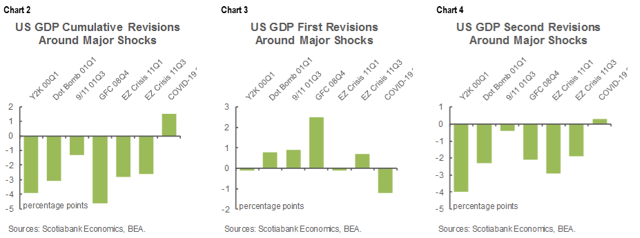 No material revision is expected to US Q3 GDP (8:30amET) as the final services spending tally gets incorporated into the final revision. Remember that the US releases advance, then second and then final quarterly GDP estimates. Tomorrow’s is the final. That doesn’t mean there will not be a further revision as they are pretty common around major shocks and in general. Chart 2 shows the cumulative revisions to US GDP growth from initial print to final around major recent shocks. Chart 3 shows the magnitude of the first revisions around these shocks. Chart 4 is the one that is pertinent to tomorrow’s release and it shows that revisions can still be material in the final round. Of course revision risk in percentage terms should perhaps be viewed in proportionate terms given the magnitude of the shock this year.