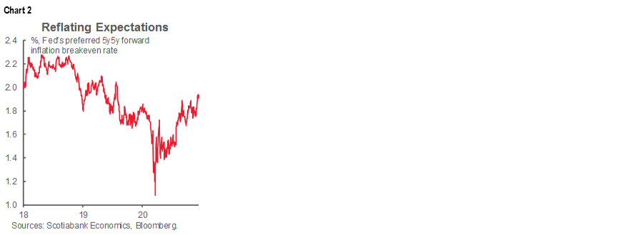 US CPI for November (8:30amET) is expected to be little changed. I went down a tick to 1.1% y/y with the month-ago rate up a tick to 0.1% m/m due to seasonals, gas and jumping off points. Core is expected to be flat at 1.6% but I went down a tick. Markets are likely to treat it as an historical footnote given the rise in forward-looking inflation expectations (chart 2).