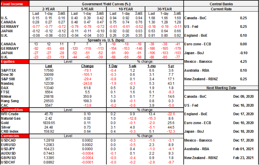 Stocks played a bit of defense today but not all for reasons having to do with the macro picture. Vaccine headlines didn’t help as Pfizer advised people with allergies to the vaccine ingredients to pass on the shot and a data breach occurred at the European Medicines Agency that involved Pfizer’s regulatory submission. Tech stocks sold off on an antitrust suit brought against Facebook. A massive oil inventory build in the US sparked volatility in oil prices as WTI initially lost a buck and then regained most of that. Markets quickly shook off the BoC’s policy statement as a non-event (recap here). The thesis that the CUSMA/USMCA deal would not sweep aside trade irritants as sector files would remain hotly contested was somewhat validated as the US filed its first enforcement action under the agreement against Canada’s dairy industry.