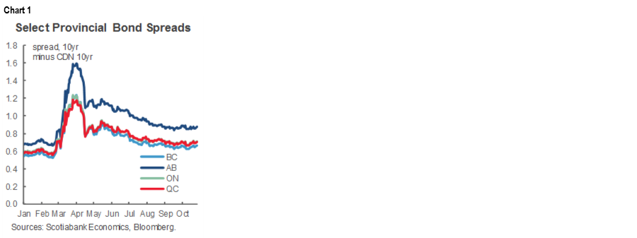 Against this backdrop the Ontario government bravely committed to delivering a three-year budget plan on Fed day (November 5th) after cancelling the March budget. The province’s spreads over Canadas have retained improvement of late but remain slightly wider than pre-crisis (chart 1).