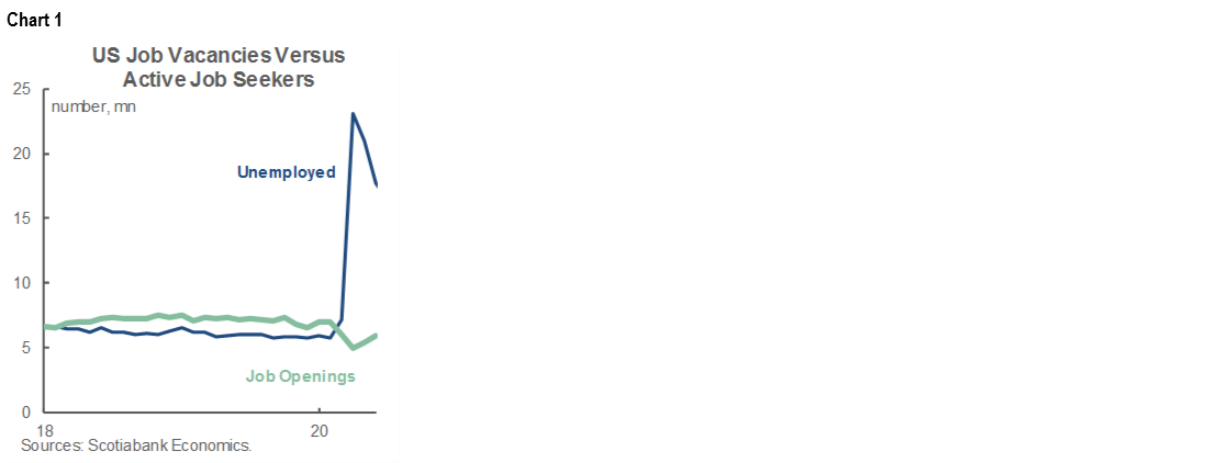 Still, however, the great wild card remains what happens to those who are counter as unemployed but on temporary layoff. There are still 9.22 million of them versus the normal run-rate before the pandemic of around three-quarters of a million. While JOLTS job vacancies lag with only June data available, thus far, the rise in job vacancies has been nothing to satisfy the sheer number of unemployed (chart 1).
