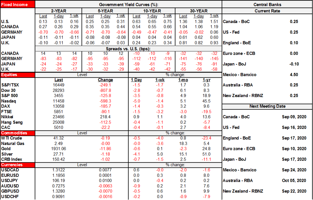 There are plenty of after the fact possibilities, but none are clearly superior to one another. Folks suddenly got worried about valuations? Maybe, but why today, and at a price-to-forward ratio in 2021 (the first full year of post-pandemic projected earnings recovery) of 20.75 times, it’s not obvious that snps were overvalued despite what the perma-bears say. The uber bears look at this year’s price-to-earnings that is distorted by the denominator. Maybe it’s apprehension ahead of nonfarm payrolls, but this would be an outsized illustration of such concern. Tech played a major role with IT stocks on the S&P down 6.4%, but every sector straight through defensives fell so the explanation cannot just stop at tech. Maybe markets don’t like Trump’s chances and are worried about capital gains and income taxes, but if so, they’re reacting to polls that have favoured Biden for some time as opposed to all of a sudden. Maybe this morning’s ISM-services dip to 56.9 (58.1 prior) spooked folks toward slowing economy concerns, but it was on expectations and cooling impulses from the immediate aftermath of reopening plans were always to be expected. Let’s go with one explanation we can probably all agree upon: more sellers than buyers.
