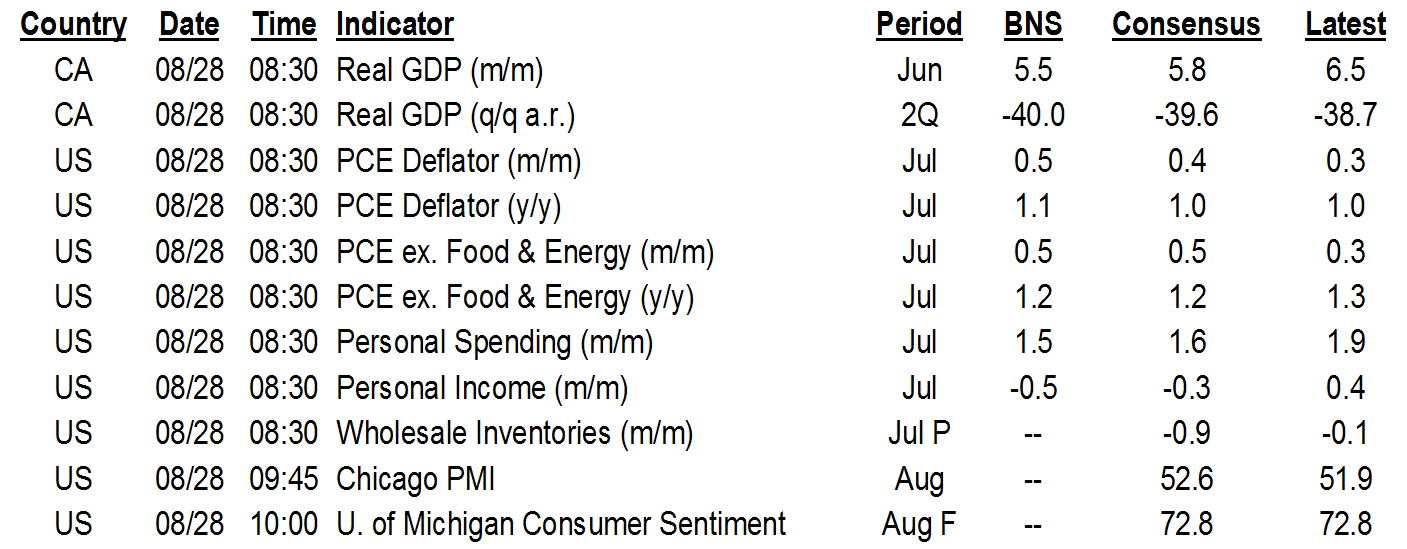 A separate stand alone recap will follow with greater detail, but for now, Canadian GDP growth landed as follows. The economy grew by 6.5% m/m in June and posted further growth of 3% in July according to StatsCan’s preliminary estimate. The Q2 contraction of -38.7% compares favourably to expectations (consensus -39.6%, Scotia August 3rd print -40%, Scotia nowcast -38.7% (!!)) but is less than the initial flash guidance that StatsCan provided on July 31st (-12% q/q non-annualized). The Q2 figure is also the least relevant figure of the bunch from a market standpoint.