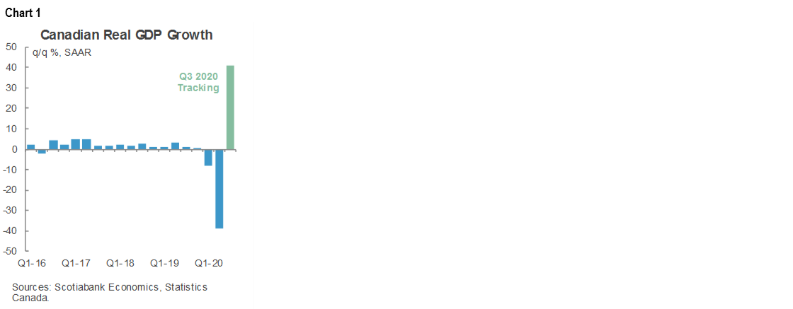 That’s because markets care about rebound evidence and its tracking and that’s where the releases were strong. So strong, in fact, that they suggest preliminary tracking of a 41% annualized rebound in Q3 GDP (chart 1) with important caveats like how it’s based solely on July GDP and Q2 while assuming flat readings in August and September. This tracking is also using monthly GDP from a production side perspective whereas quarterly GDP based upon expenditure readings can differ and at times materially so. Still, 41% growth in Q3—if it sticks with further data and upon converting to expenditure concepts—exceeds our expectations for a Q3 growth rate of 33% (consensus +35%).