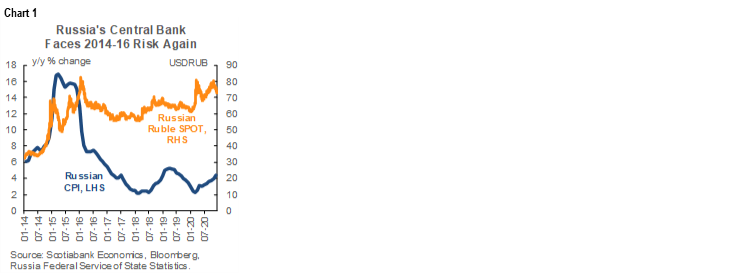 Russia’s central bank held at 4.25% as widely expected. Governor Nabiullina remarked that it’s unclear if rate cuts remain possible. Ha! I have a feeling the central bank is going to be headed in the opposite direction in 2021 in order to manage another currency and inflation crisis. If we go from allegations to proof that it was Russian state-sponsored hackers that launched cyberwar against the west and particularly the US, then expect sweeping retaliatory measures early in Biden’s administration. By extension, Nabiullina could well face a repeat of what happened in 2014–16 when the ruble tanked and inflation soared (chart 1).