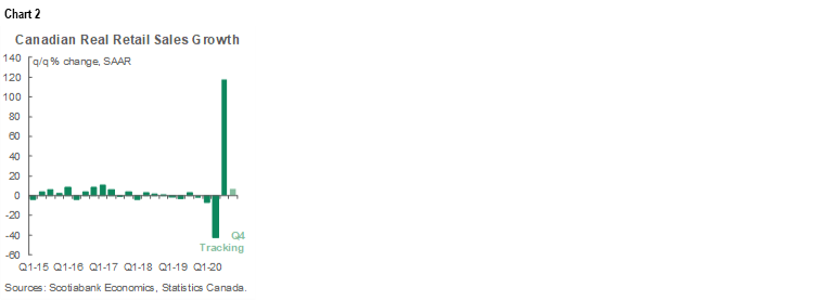 Quarterly tracking is pointing to a Q4 rise of 6.8% q/q at a seasonally adjusted and annualized rate (SAAR) following a 121% recovery-fed gain in Q3 (chart 2). That indicates sustained momentum on a quarterly tracking basis which benefits Q4 GDP growth after adjustments to GDP concepts.