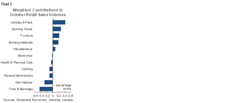 Chart 3 shows the breakdown of growth in sales volumes during October over September in terms of weighted contributions to overall sales growth. Autos, sporting goods, furniture and furnishings and building materials/reno activities led the way.
