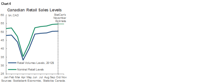 Total retail sales beat StatsCan’s earlier guidance by posting a 0.4% m/m nominal rise that was evenly split between higher volumes (+0.2% m/m) and higher prices. Excluding autos, the dollar value of sales was flat and volumes fell 0.3% m/m. Upward revisions to the prior month’s sales tally largely explain this away. The dollar value of total retail sales was revised up to a gain of 1.9% m/m in September (from 1.1% initially) and ex-autos was revised up to a gain of 1.9% (from 1.0%). In volume terms, September posted a revised 1.8% rise in total sales and a 2% rise in sales ex-autos.