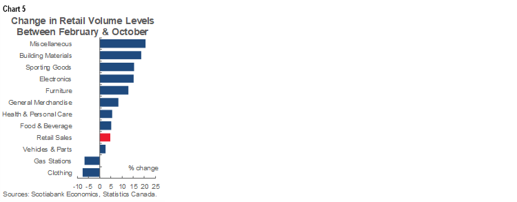 Put another way, the only sectors not to have fully recovered thus far (and then some!) include ones that probably won't surprise you (chart 5). Gas station volumes are 7% lower than pre-pandemic levels as our cars and trucks sit parked. Clothing is down 8% because we're all wearing pyjamas. Shoe sales are down 5% on similar work-from-home logic. Jewellery & luggage stores are down 2.5% because few are travelling or showing off their bling. Everything else is higher than pre-pandemic.