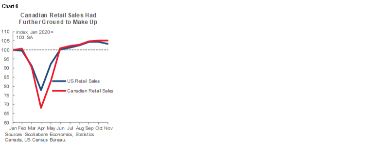 Now, about Canada-US comparisons. StatsCan’s November guidance (flat) is still better than what happened in the US on Wednesday when preliminary numbers showed sales down 1.1% m/m and sales were revised down in October to a mild drop of –0.1% m/m. Is this a Canadian resilience narrative in play? Maybe, but then again, Canada’s retail sector went down harder in the March–June period than was the case in the US (chart 6). Resilience is so far only really a one month preliminary assessment for November, whereas the two countries have been tracking virtually identically to one another for several months since June. That’s despite the fact Canada arguably might have had more pent-up demand from a harsher initial hit, albeit that Canada also dealt with the added commodities punch.