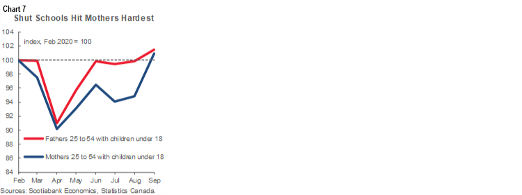 On that note, recall that Ontario advised parents yesterday to prepare for renewed school closures in January which represents the risk of another serious shock to labour markets. Recall how long it took for employment of mothers to recover (chart 7) after they were hit particularly hard by school closures. Maybe the effects will be less severe this time because a) technology and work from home options are better developed, b) there is some lead time to prepare unlike the shock in March, and c) there are more income and job supports now than obviously at the start of the pandemic and Canada—unlike the US—has already extended those supports well into 2021.