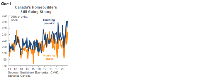 Calendar-risk is basically zero as we only have three minor things to consider. One is that Turkey’s central bank hiked by more than consensus expected by taking the policy one-week repo rate up 200bps to 17% this morning on inflation concerns and that drove lira appreciation. Second is that the Bank of Thailand held at 0.5% as universally expected. Third is a positive signal on Canadian housing markets given a 7.9% m/m surge in Canadian homebuilding permit volumes during November that points to ongoing strength in housing starts (chart 1).