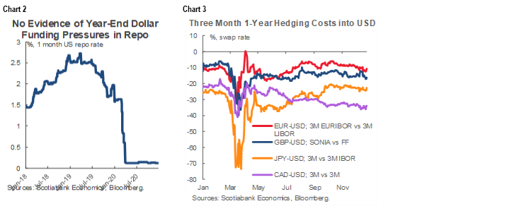 4. Dollar funding: Year-end for US companies normally brings with it demand for dollar funding in part to engage in some year-end window dressing of balance sheets. Sometimes it can spark upheavals in markets. So far there isn’t really any evidence of anticipated pressures in repo markets (chart 2) or in FX hedging costs (chart 3). If risk appetite is shocked by Brexit or US stimulus developments or other random developments, then it’s feasible that a surge in demand for dollar funding within more thinly traded holiday markets could be disruptive. The Fed’s actions to extend dollar swap arrangements with foreign central bank counterparties probably mitigates this risk by continuing the option to spring the taps on dollar liquidity.