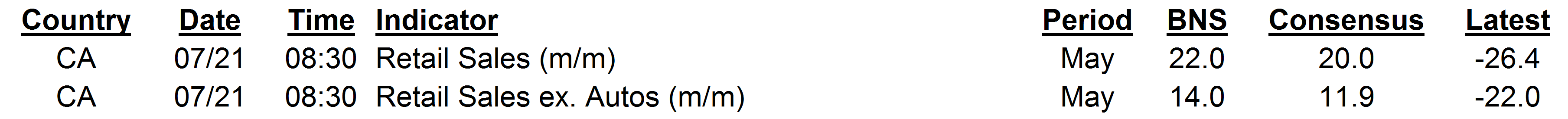 In N.A., the main focus will be upon Canadian retail sales (8:30amET). Not only will we get May’s results, we should also get a preliminary estimate for June that would give us a fresher overall reading. See last night’s Closing Points (here) and the Global Week Ahead (here) for more detail on the retail estimates.