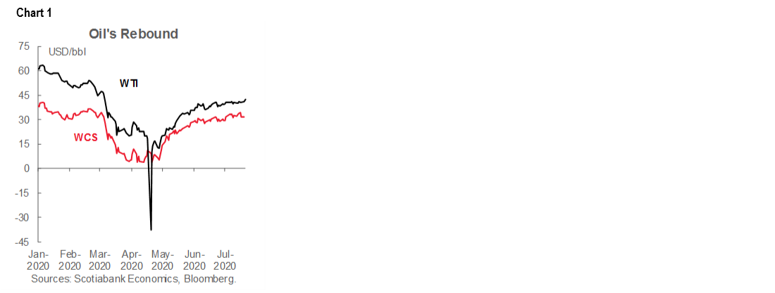 - Oil prices are up by about 3% in terms of Brent and WTI. Western Canada Select—a proxy for heavy crude—is holding in around the US$31½ range compared to the low of under $4 in late April and the mid-30s range before widespread shut downs in March.