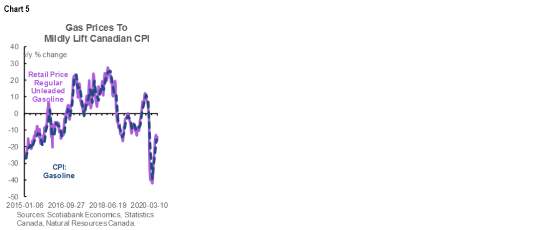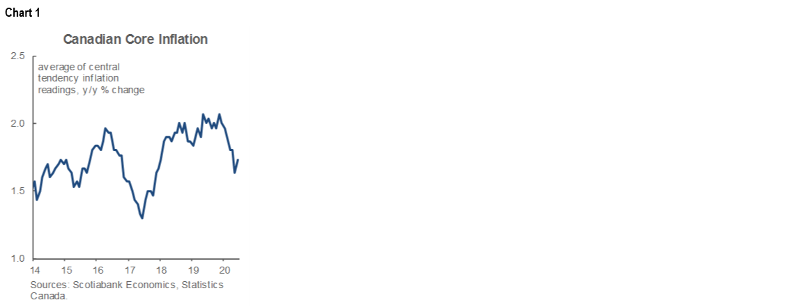The main reason the BoC would ignore the release is that it’s too soon to expect most of the adjustment lower in the core measures. As spare capacity has ballooned, more of this lagging effect is likely to come with a 3–5 quarter lag which is one reason behind why we expect the average ‘core’ measure to dip below 1% y/y toward year-end into early 2021. The BoC is likely to remain anchored to this longer run view and dismiss short-term readings. If we have firm—let alone higher—core inflation along that time frame then that would obviously be material information, but we don’t have that today.