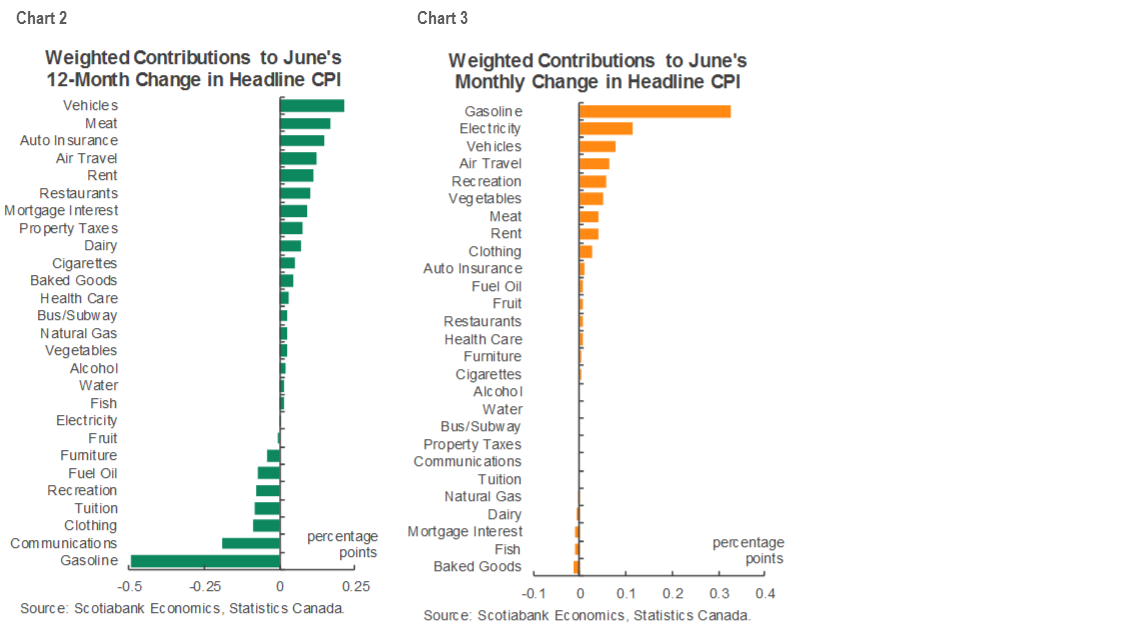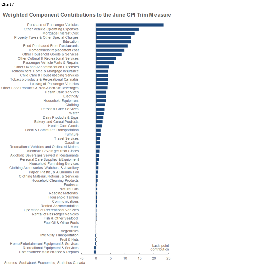 · Chart 7 shows the breakdown of what got included in the trimmed mean CPI core measure in June. The biggest outlier moves were excluded such that components like gas and electricity prices did not impact the core measure.