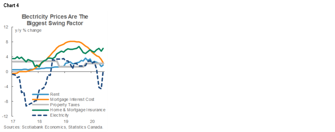 · Electricity prices spiked higher because they increased by 17% y/y in Ontario for the biggest rise since May 2003 as a result of higher prices that were introduced on June 1st. In month-ago terms this driver should drop out in July but will continue to impact the year-over-year readings until June 2021 barring further policy changes. Chart 4 shows electricity price inflation along with what at times have been other transitory drivers. For instance, mortgage interest cost is finally turning lower and with more to come given the lags to policy rate and market rate changes.