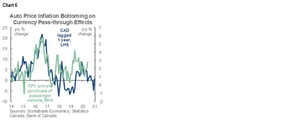 · I’m a little surprised by auto prices and had not factored a mild positive contribution to higher inflation from that part of the basket. As chart 6 shows, auto prices should follow the currency with a lag over time and yet they increased this time. It’s not an airtight relationship mind you. Strong sales momentum during May and June during the initial phase of the recovery was likely a driver of pricing power, but the relationship between sticker prices and USDCAD could reassert itself to the downside with a lag.