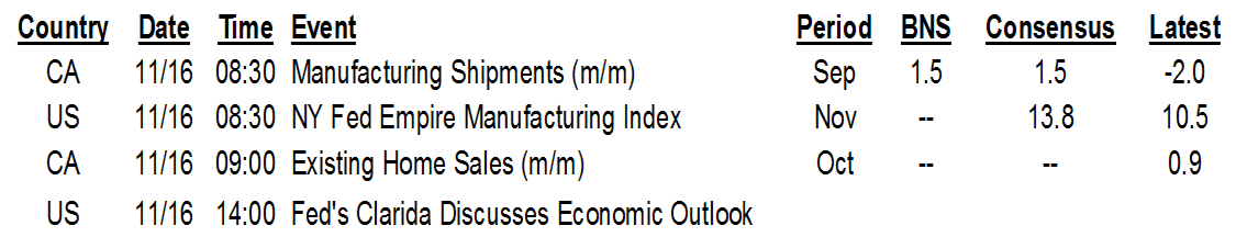 Canadian manufacturing sales grew by 1.5% m/m in September which matched StatsCan’s advance guidance. Volumes were up by 2.1% m/m as prices slipped. The release is inconsequential to markets and the same will be true when existing home sales during October are released (9amET).
