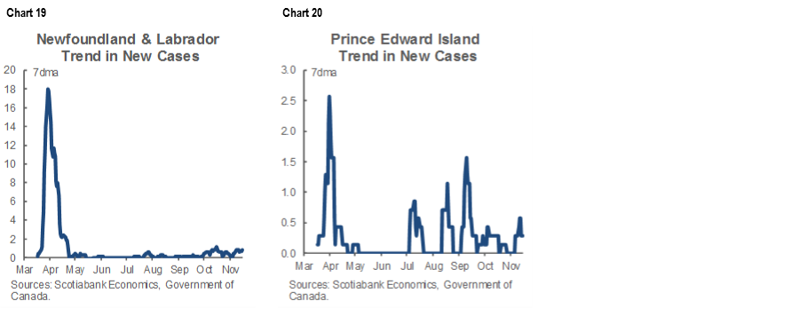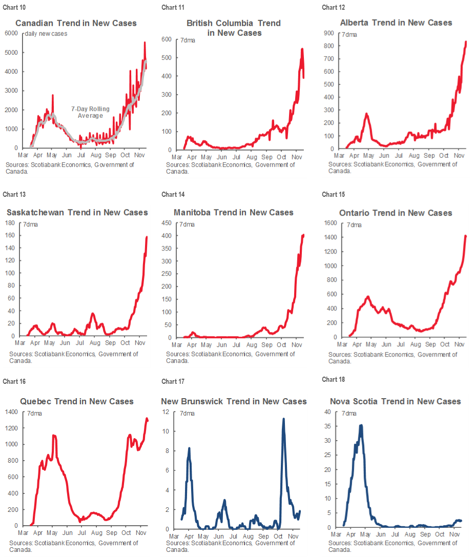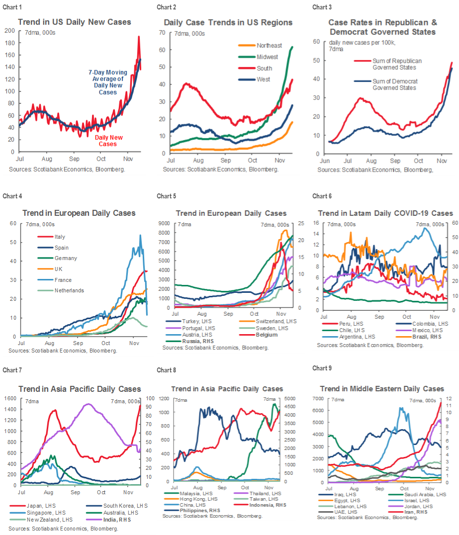 - US stock futures were up before the Moderna headlines hit because of the reduced risk of a US shutdown, but the vaccine headlines added some momentum. S&P500 futures are up by over 1%, TSX futures are up by ½% and European cash markets are up by 1–3% or so after Asia was a sea of green overnight. In general, stocks that benefit from the pandemic (tech, broad health care, defensives like utilities) are underperforming as the lead is taken by energy, materials, banks (on steeper curves), consumer discretionary plays and industrials.