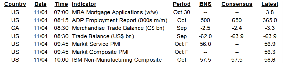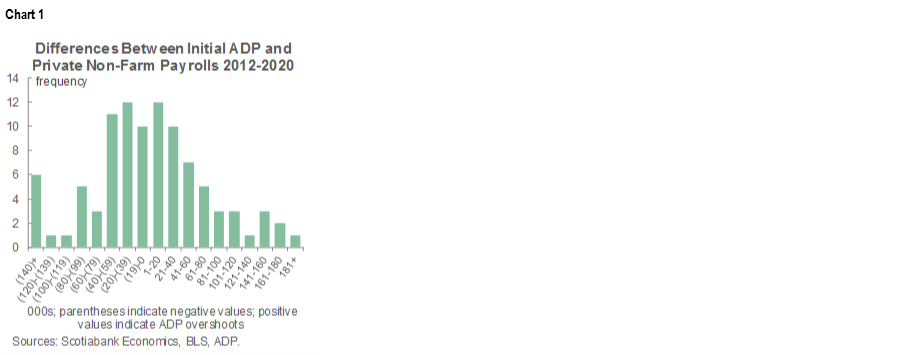 ADP private payrolls landed at 365k in October (643k consensus, Scotia 500k) and the prior month’s revision was small from 749k up to 753k. This implies high odds that the consensus estimate of 700k is far too high for private nonfarm payrolls on Friday. Chart 1 shows the rarity of such a large difference between initial ADP and initial nonfarm estimates.