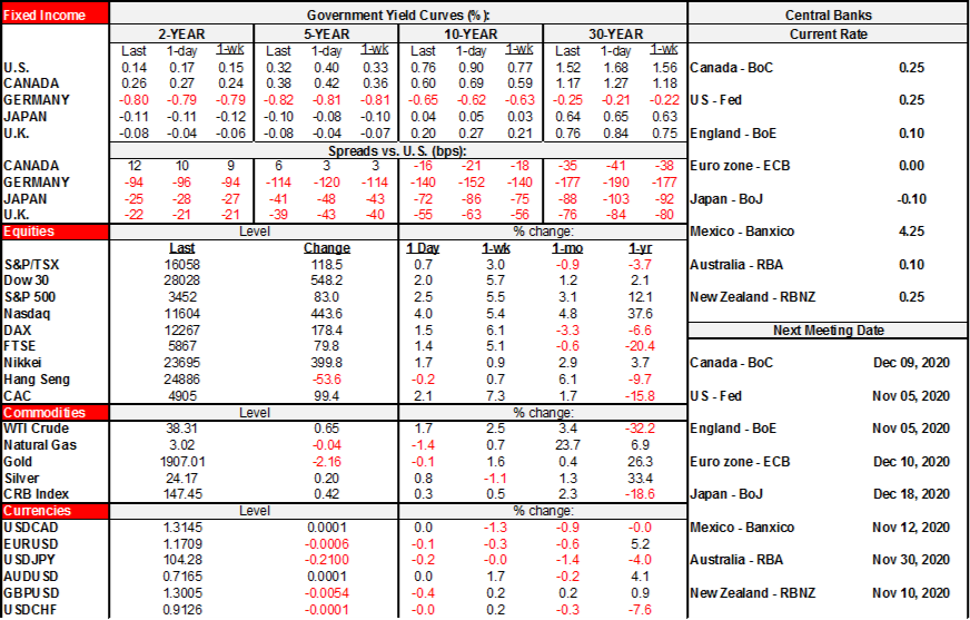 The states where results are still outstanding leave pathways to victory for either Trump or Biden, albeit with a slim evolving margin very tentatively favouring Biden in my view. Vote tallies will continue today through to the end of the week at a minimum. Toward the end of the day, however, we should have a stronger sense of whether the stragglers where results might not be known until tomorrow or Friday or possibly later will actually matter or not. I’ve highlighted the current status of the uncertainties in the key remaining states below. The risk of a contested outcome is material after Trump did what most expected by prematurely claiming victory and saying that vote counting should stop as mail-ins continue to be counted. So is the risk that either candidate who wins the Oval office may be neutralized by the other party taking the Senate, but at this point, any combination for the Presidency and the Senate remains viable. Other developments are irrelevant this morning as markets looked the other way after US ADP private payrolls disappointed the consensus guess with ISM-services on tap.