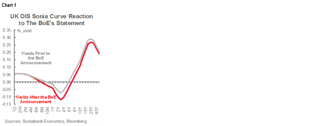 The Bank of England drove sterling to depreciate, gilts to rally and the Sonia OIS curve to further price prospects for a negative policy rate (chart 1). Not bad for a day’s work I’d say. What did the trick was the following line in the accompanying minutes (here) to the statement itself (here):