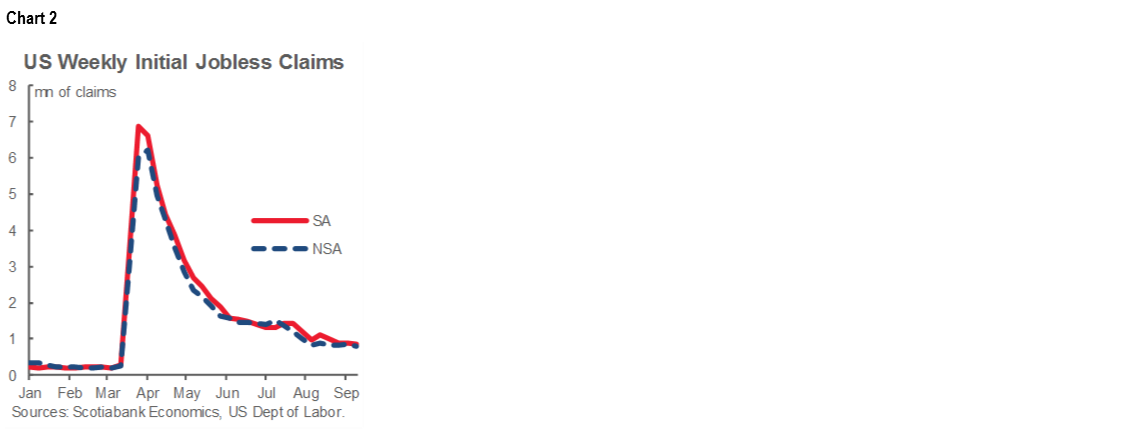 Initial jobless claims fell by less than guessed to 860k (850k consensus, 800k Scotia) and the prior week was revised up a bit to 893k from 884k. Nevertheless, the downward trend continues, just at a somewhat uninspiring pace (chart 2). Continuing claims indicate longevity of unemployment and so their decline to 12.63 million from and upwardly revised 13.54 million (from 13.39) was a bit more encouraging. Continuing claims are at their lowest since the first week of April.