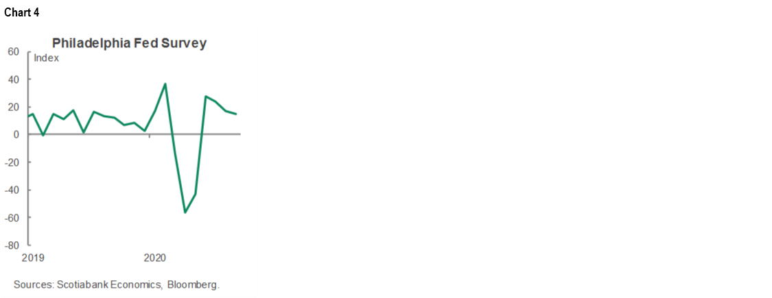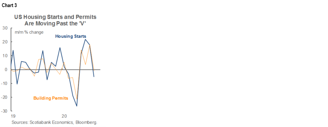 US housing starts fell by 5.1% m/m and the prior month was revised lower to a 17.9% m/m rise instead of 22.6%. Permits also lost some steam as they slipped by 0.9% m/m and the prior month was revised a little softer to 17.9% m/m, or down by about 1%. The ‘V’ in home construction is coming back to earth (chart 3).