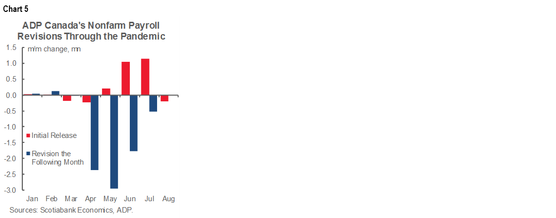 It’s an understatement to say that ADP’s jobs report has some issues to work out if it really wants to rival StatsCan’s household and (lagging) payroll surveys. Witness chart 5. For the fourth straight month, ADP revised its jobs numbers by seven figures. The difference between the sum of their initial estimates for monthly job changes from April to July and the revised estimates is a net cumulative revision of about 10 million jobs. StatsCan’s Labour Force Survey says there are about 18 million employed Canadians in total. I realize that’s mixing samples, but hey, that’s quibbling when revisions amount to somewhere around half or more of the total number of employed Canadians in just four months!