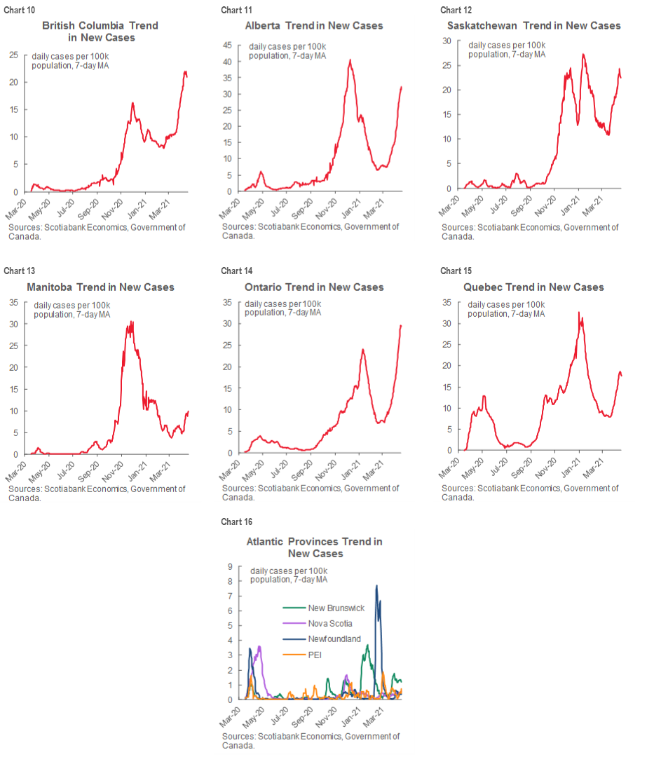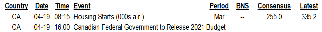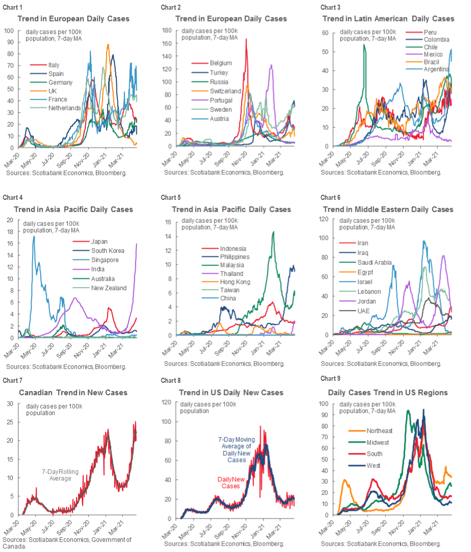 Risk appetite is mixed across asset classes. There are no real calendar-based forms of incremental risk to inform developments. A quiet global calendar will make Canada’s federal budget stand out perhaps a little more than would otherwise be the case. Also see the accompanying suite of charts depicting daily new COVID-19 case trends by country and Canadian province.