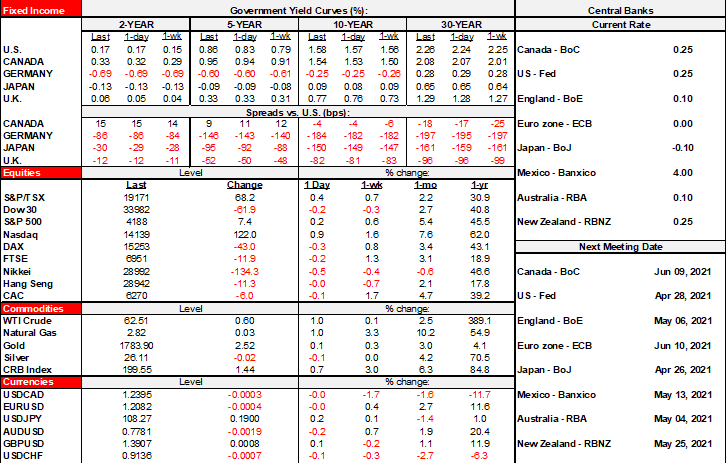 Global market moves are pretty limited across asset classes. The US$ is flat overall, longer dated sovereigns are slightly cheaper, stocks are little changed in Europe and N.A. futures and oil is bouncing back a bit. Overnight calendar-based risk offered no surprises while US earnings roll in from companies like GE, UPS, 3M etc. So far this season, 76% of S&P firms have beaten analysts’ earnings expectations and 75% have been revenue expectations. The main risk remains focused on the Fed and Biden’s not-SOTU speech tomorrow night.