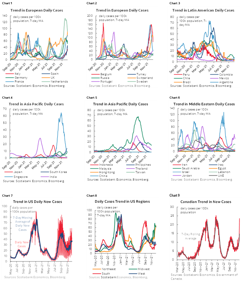 COVID-19 developments are focused upon rapidly rising cases across more parts of the world, while Moderna’s booster tests point toward as much success in countering omicron’s hit to antibody levels as the earlier results for the Pfizer booster. We’re still left with little evidence on severity of omicron cases at this stage. Early evidence on severity seems to be cautiously optimistic, but it’s highly premature to draw overly strong conclusions in that regard given the recency of developments. We’ll need to wait until into January before having more information on severity. The usual Monday round-up of global COVID-19 cases is provided in the collection of ensuing charts.