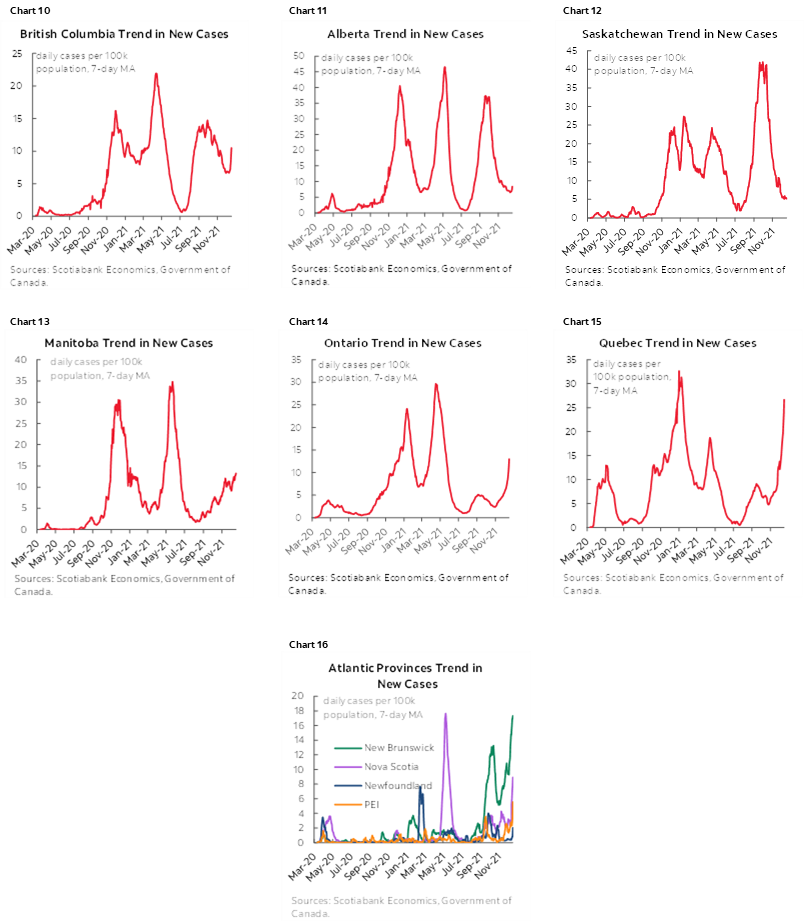 - Canada: Cases are rapidly rising. Quebec is leading the climb, but material increases are also occurring in Ontario, BC, Manitoba, New Brunswick and Nova Scotia.