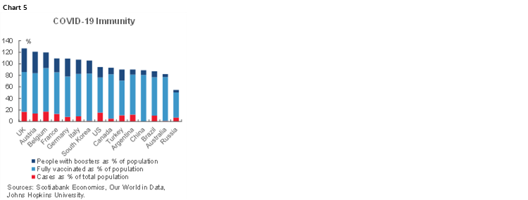 Also, given evidence that one is probably well protected against omicron if you’ve either had COVID-19 and then been fully vaccinated or had three doses, it’s worth taking a look at super-immunity readings across the global population (chart 5). The UK actually tops the list with the biggest combined share of the population that has had it, been fully vaccinated and boosted. It’s a rough gauge since the categories are not additive in reality.