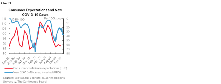 - It could be the most significant of the releases, but it might be too early for December’s consumer confidence (10amET) to show much reaction to the omicron variant given that only a portion of the sample up to last Friday would capture omicron’s escalating effects. Chart 1 shows the rough connection between new COVID-19 cases and the expectations component of the confidence gauge.
