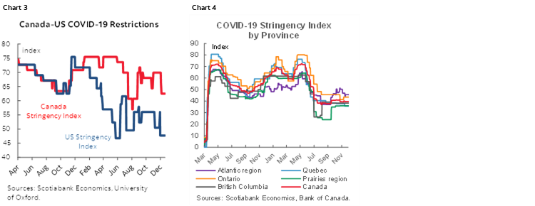 Further, with figures up to the other day, US and Canadian stringency indices remain low (few restrictions) as shown in chart 3. Chart 4 breaks this down in Canada by region.