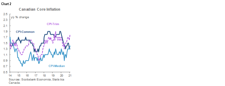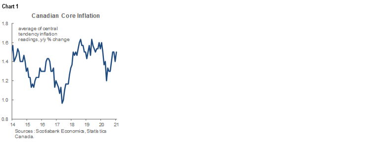 Canadian core CPI inflation climbed a tick to 1.5% y/y using the average of the three central tendency measures but remains range-bound around 1½% y/y for about the past five months (chart 1).