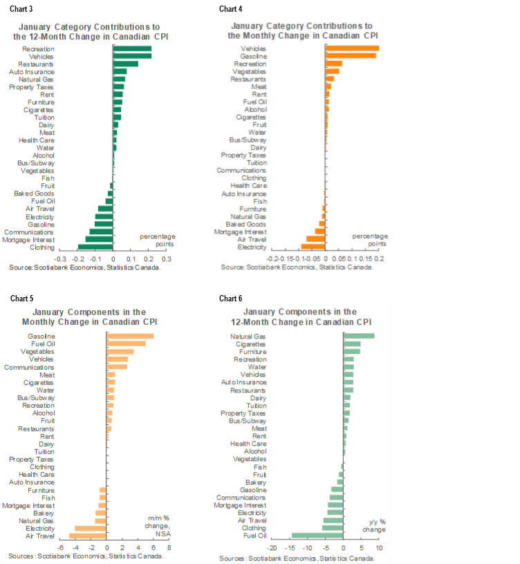 Charts 3 and 4 provide weighted contributions to overall inflation on a year-over-year basis (chart 3) and month-over-month basis (chart 4) in order to depict what categories drove the report. Unweighted changes in prices within the CPI basket are shown in charts 5 and 6.